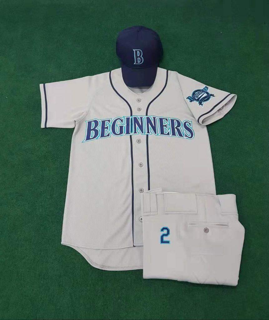 今日ご紹介させて頂きますオーダーユニフォームはこちらBeginner様の灰色・ネイビー刺繍ユニフォームでございます。